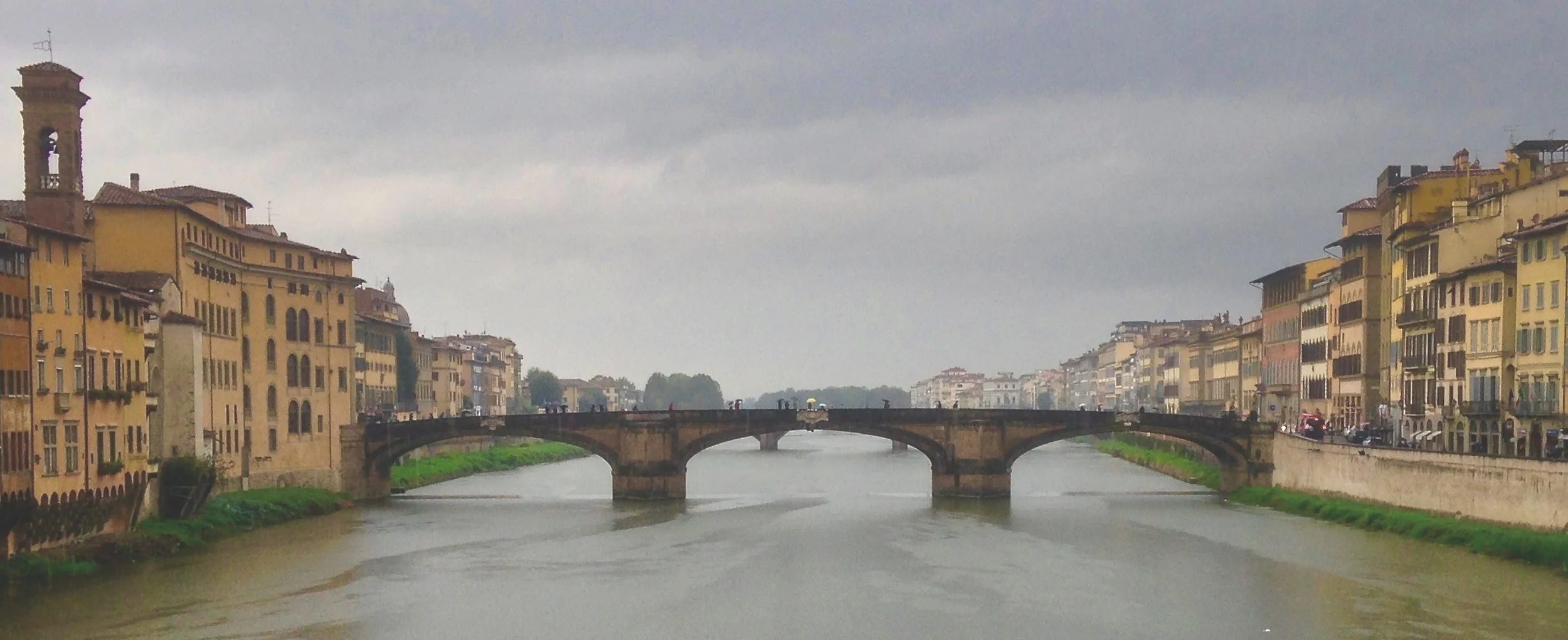 As we approached Ponte Vecchio, the rain subsided, and the bridge was illuminated by the sunlight breaking through the clouds. We paused mid-bridge to admire the swift river below. Looking upriver, we saw the majestic Ponte Santa Trinta Bridge standing gracefully across the Arno River. The diffused light of the cloudy sky created the perfect lighting for a photo. Almost instinctively, I raised my camera to snap the image, unexpectedly capturing this beautiful image.